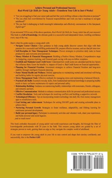 "Achieve Personal and Professional Success: Real-World Life Skills for Young Adults-Transform Your Life in Just 4 Weeks!""Are you struggling to find your career path and feel like you're drifting without a clear direction or purpose?" "Do you often feel overwhelmed by financial responsibilities and wish you had a roadmap to navigate adulthood?" "Do you find it challenging to build meaningful relationships and effectively communicate in this fast-paced, digital age?" If you answered YES to any of the above questions, Real-World Life Skills for Young Adults has all your answers! This book is a Gift of Knowledge, the ultimate guide to a successful and independent future, instilling confidence every step of the way. Here's what the guide equips a young adult with:Navigate Career Choices: Clear guidance to help young adults discover careers that align with their passions for a successful and fulfilling professional life, prepare effective resumes, and ace that job interview. Self-Discipline & Time Management Techniques: Proven strategies to prioritize daily tasks to boost productivity and overcome procrastination. Money Mindset & Financial Management: Building a Positive Money Mindset, Comprehensive steps for budgeting, expense tracking, and financial goals saving with easy-to-follow templates. Establish and Maintain Good Credit Score: Understand how credit scores are calculated and the key factors that influence them. Know the benefits vs. impacts of Good vs. Bad Credit Scores on financial opportunities. Planning for Financial Freedom: Investment strategies to achieve financial freedom and long-term stability through intelligent financial planning. Foster Mental Health and Stress Management: Holistic approaches to maintaining mental and emotional well-being and building habits for regular physical exercise. Practical Life Skills: Essential everyday skills, from fundamental nutritional knowledge to preparing healthy meals to basic car/home maintenance & repairs and personal safety. Effective Communication and Relationship Building: Methods to enhance communication skills for personal and professional success and foster healthy relationship. Nurturing Personal Growth: Strategies to foster resilience, adaptability, and lifelong learning for continuous personal development. Build your personal legacy: Participate in community activities and volunteer work, share your experiences, and build personal and social legacies. If you want to empower the young adult in your life to take control and shape their destiny confidently and successfully, this is the Perfect Gift!