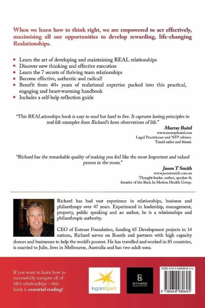 REALationships describes how to navigate our world of complex connections. It teaches the reader how to develop thriving relationships in the corporate world, business environment, as a leader or working as part of a team and how to manage successful relationships with family and friends alike. Learn the art of developing and maintaining REALationships. Discover new ways to approach relationships and develop effective execution. Learn the seven secrets of thriving team relationships. Become effective, authentic and radical in your approach. Benefit from 40+ years of the author's relational expertise packed into a practical, heart-warming handbook. Use the self reflection guide at the end of each chapter to build the lessons into your daily life. If you want to learn how to successfully navigate all of life's relationships - this book is essential reading.