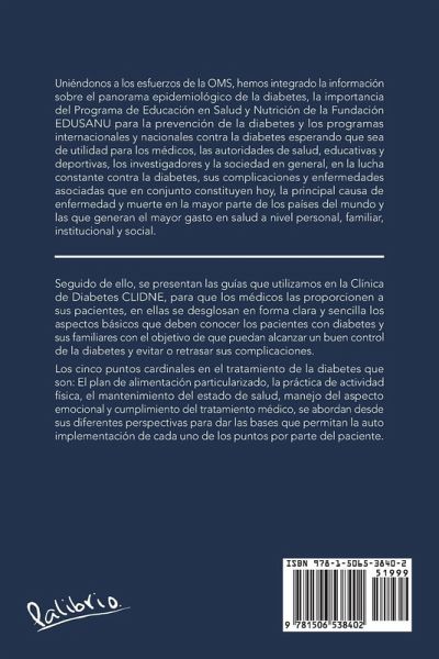 Uniéndonos a los esfuerzos de la OMS, hemos integrado la información sobre el panorama epidemiológico de la diabetes, la importancia del Programa de Educación en Salud y Nutrición de la Fundación EDUSANU para la prevención de la diabetes y los programas internacionales y nacionales contra la diabetes esperando que sea de utilidad para los médicos, las autoridades de salud, educativas y deportivas, los investigadores y la sociedad en general, en la lucha constante contra la diabetes, sus complicaciones y enfermedades asociadas que en conjunto constituyen hoy, la principal causa de enfermedad y muerte en la mayor parte de los países del mundo y las que generan el mayor gasto en salud a nivel personal, familiar, institucional y social. Seguido de ello, se presentan las guías que utilizamos en la Clínica de Diabetes CLIDNE, para que los médicos las proporcionen a sus pacientes, en ellas se desglosan en forma clara y sencilla los aspectos básicos que deben conocer los pacientes con diabetes y sus familiares con el objetivo de que puedan alcanzar un buen control de la diabetes y evitar o retrasar sus complicaciones. Los cinco puntos cardinales en el tratamiento de la diabetes que son: El plan de alimentación particularizado, la práctica de actividad física, el mantenimiento del estado de salud, manejo del aspecto emocional y cumplimiento del tratamiento médico, se abordan desde sus diferentes perspectivas para dar las bases que permitan la auto implementación de cada uno de los puntos por parte del paciente.