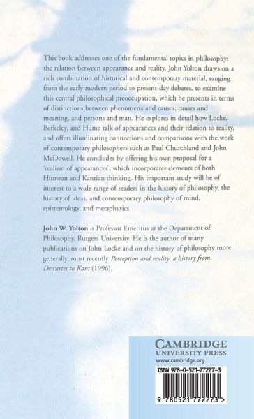 This book addresses one of the fundamental topics in philosophy: the relation between appearance and reality. John Yolton draws on a rich combination of historical and contemporary material, ranging from Locke, Berkeley and Hume to Churchland and McDowell, to examine this central philosophical preoccupation, which he presents in terms of distinctions between phenomena and causes, causes and meaning, and persons and man. His important study will be of interest to a wide range of readers in the history of philosophy and in contemporary philosophy of mind, epistemology and metaphysics.