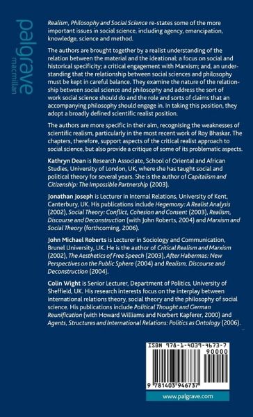 The authors examine the relationship between social science and philosophy and ask what sort of work social science and an accompanying philosophy should do. They reintroduce the question of ontology, through the work of Roy Bhaskar. The book argues against philosophising and is committed to a philosophical approach grounded in the social sciences.
