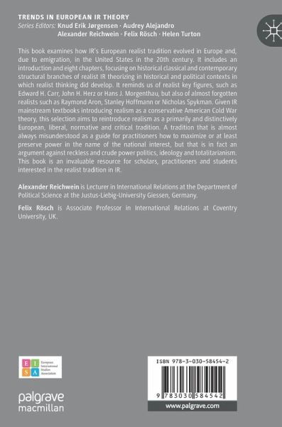 This book examines how IR's European realist tradition evolved in Europe and, due to emigration, in the United States in the 20th century. It includes an introduction and eight chapters, focusing on historical classical and contemporary structural branches of realist IR theorizing in historical and political contexts in which realist thinking did develop. It reminds us of realist key figures, such as Edward H. Carr, John H. Herz or Hans J. Morgenthau, but also of almost forgotten realists such as Raymond Aron, Stanley Hoffmann or Nicholas J. Spykman. Given IR mainstream textbooks introducing realism as a conservative American Cold War theory, this selection aims to reintroduce realism as a primarily and distinctively European, liberal, normative and critical tradition. A tradition that is almost always misunderstood as a guide for practitioners how to maximize or at least preserve power in the name of the national interest no matter the cost, but thatis in fact an argument against reckless and crude power politics, ideology and totalitarianism. This book is an invaluable resource for scholars, practitioners and students interested in the realist tradition in IR.
