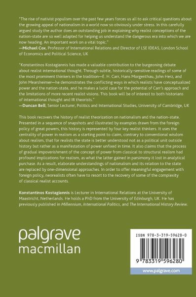This book recovers the history of realist theorization on nationalism and the nation-state. Presented in a sequence of snapshots and illustrated by examples drawn from the foreign policy of great powers, this history is represented by four key realist thinkers. It uses the centrality of power in realism as a starting point to claim, contrary to conventional wisdom about realism, that for realists the state is better understood not as a political unit outside history but rather as a manifestation of power unfixed in time. It also claims that the process of gradual impoverishment of the concept of power from classical to structural realism had profound implications for realism, as what the latter gained in parsimony it lost in analytical purchase. As a result, elaborate understandings of nationalism and its relation to the state are replaced by one-dimensional approaches. In order to offer meaningful engagement with foreign policy, neorealists often have to resort to the recovery of someof the complexity of classical realist accounts.