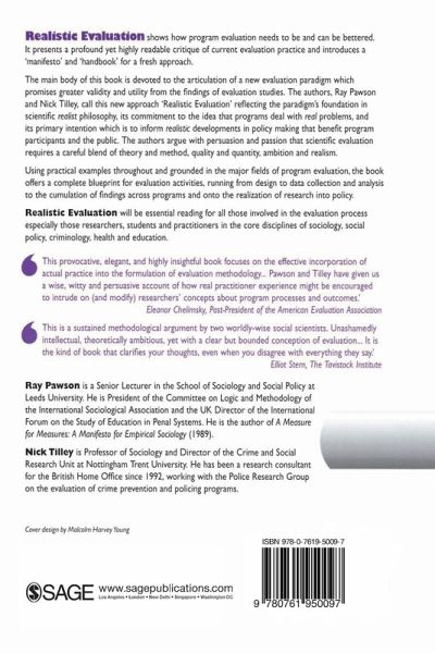 `This is a sustained methodological argument by two wordly-wise social scientists. Unashamedly intellectual, theoretically ambitious yet with a clear but bounded conception of evaluation. It is articulate, occasionally eloquent and always iconoclastic, whilst eschewing "paradigm wars". The Pawson and Tilley "realist" call to arms threatens to take no prisoners among experimentalists, constructivists or pluralists. It is the kind of book that clarifies your thoughts, even when you disagree with everything they say' - Elliot Stern, The Tavistock Institute
