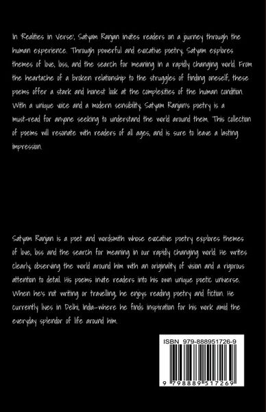 These poems are a reflection of the complexities of the human experience. They explore themes of love, loss, and the search for meaning in a rapidly changing world. They are not always easy to read, but they are honest and true. I have poured my heart and soul into these words, and I hope that they will touch your hearts in the same way. I believe that poetry is a powerful tool for self-discovery and for understanding the world around us. It has the ability to express the inexpressible and to connect us to our deepest emotions and experiences. Through these poems, I hope to provide you with a glimpse into my world and my perspective. So, as you begin to read ""Realities in Verse"", I invite you to open your mind, your heart and to let the words speak to you. I hope that they will inspire you, challenge you and that they will leave a lasting impression. Satyam Ranjan