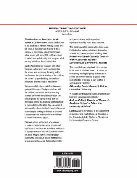 The Realities of Teacher' Work: Never a Dull Moment follows the fortunes of the teachers at Hillview Primary School over ten years. It explores what it is like to be a primary or elementary school teacher in an urban school with about 200 children, mixed in social class and ethnicity, and suggests what we may learn from them for the future.Sandra Acker links her research with other literature on teachers' work, and describes the school as a workplace, focusing on four key features: the characteristics of the children, the school's physical setting, the available resources, and the ethos of the school.She successfully places us in the classroom giving vivid images of daily interactions with the children, and shows too how teaching extends far beyond the classroom door. The book explores the caring culture that has developed among the teachers and helps them to cope with the difficulties they encounter. It also considers the school as located in the wider community by looking at changes in teachers' careers over time and the effects on Hillview of recent educational reform.This book shows us how and why we need to revise our assumptions about schools and teachers and see them not as isolated individuals in closed classrooms and self-contained schools, but as an integral part of a much broader community. Above all, it shows that teaching is hard, demanding work that is influenced by workplace cultures and the gendered expectations society holds about teachers.
