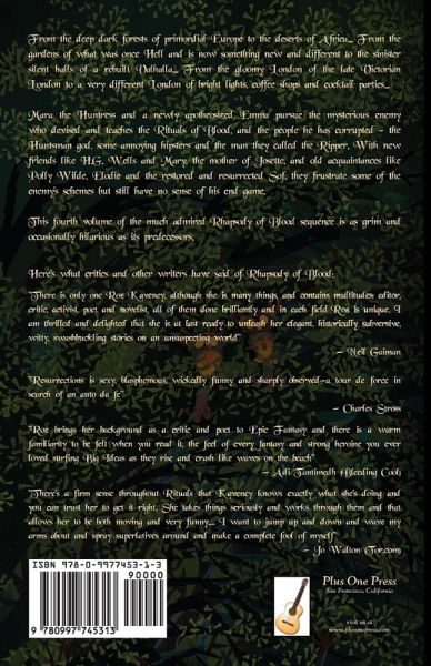 From the deep dark forests of primordial Europe to the deserts of Africa... From the gardens of what was once Hell and is now something new and different to the sinister silent halls of a rebuilt Valhalla... From the gloomy London of the late Victorian London to a very different London of bright lights, coffee shops and cocktail parties... Mara the Huntress and a newly apotheosized Emma pursue the mysterious enemy who devised and teaches the Rituals of Blood, and the people he has corrupted - the Huntsman god, some annoying hipsters and the man they called the Ripper. With new friends like H.G. Wells and Mary, the mother of Josette, and old acquaintances like Polly Wilde, Elodie and the restored and resurrected Sof, they frustrate some of the enemy's schemes but still have no sense of his end game. This fourth volume of the much admired Rhapsody of Blood sequence is as grim and occasionally hilarious as its predecessors.