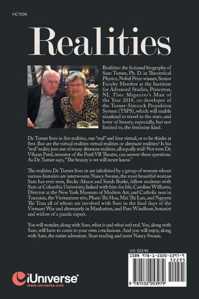 Realities: the fictional biography of Sam Turner, Ph. D. in Theoretical Physics, Nobel Prize winner, Senior Faculty Member at the Institute for Advanced Studies, Princeton, NJ, Time Magazines Man of the Year 2018, co-developer of the Turner-Simcock Propulsion System (TSPS), which will enable mankind to travel to the stars, and lover of beauty, especially, but not limited to, the feminine kind. Dr. Turner lives in five realities, one real and four virtual, or so he thinks at first. But are the virtual realities virtual realities or alternate realities? Is his real reality just one of many alternate realities, all equally real? Not even Dr. Vihaan Patel, inventor of the Patel VR Theatre, can answer these questions. As Dr. Turner says, The beauty is we will never know. The realities Dr. Turner lives in are inhabited by a group of women whose various histories are interwoven: Nancy Swann, the most beautiful woman Sam has ever seen, Becky Alsace and Sarah Burke, fellow students with Sam at Columbia University, linked with him for life, Caroline Williams, Director at the New York Museum of Modern Art, and Catholic nun in Tanzania, the Vietnamese trio, Pham Thi Hua, Mai Thi Lan, and Nguyen Thi Tran all of whom are involved with Sam in the final days of the Vietnam War and alternately in Manhattan, and Pam Windham, botanist and widow of a panda expert. You will wonder, along with Sam, what is and what isnt real. You, along with Sam, will have to come to your own conclusions. And you will enjoy, along with Sam, the entire adventure. Start reading and meet Nancy Swann.