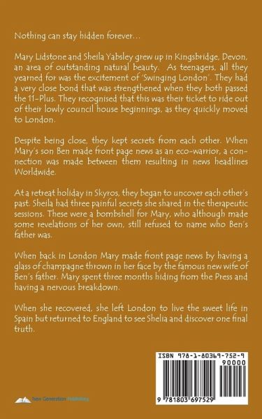 Nothing can stay hidden forever... Mary Lidstone and Sheila Yabsley grew up in Kingsbridge, Devon, an area of outstanding natural beauty. As teenagers, all they yearned for was the excitement of 'Swinging London'. They had a very close bond that was strengthened when they both passed the 11-Plus. They recognised that this was their ticket to ride out of their lowly council house beginnings, as they quickly moved to London. Despite being close, they kept secrets from each other. When Mary's son Ben made front page news as an eco-warrior, a connection was made between them resulting in news headlines Worldwide. At a retreat holiday in Skyros, they began to uncover each other's past. Sheila had three painful secrets she shared in the therapeutic sessions. These were a bombshell for Mary, who although made some revelations of her own, still refused to name who Ben's father was. When back in London Mary made front page news by having a glass of champagne thrown in her face by the famous new wife of Ben's father. Mary spent three months hiding from the Press and having a nervous breakdown. When she recovered, she left London to live the sweet life in Spain but returned to England to see Shelia and discover one final truth.