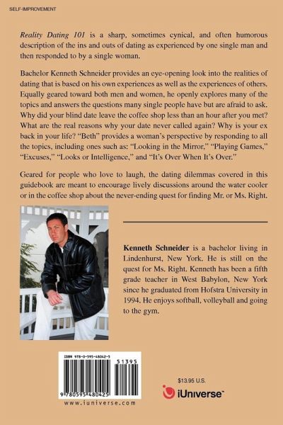 Reality Dating 101 is a sharp, sometimes cynical, and often humorous description of the ins and outs of dating as experienced by one single man and then responded to by a single woman. Bachelor Kenneth Schneider provides an eye-opening look into the realities of dating that is based on his own experiences as well as the experiences of others. Equally geared toward both men and women, he openly explores many of the topics and answers the questions many single people have but are afraid to ask. Why did your blind date leave the coffee shop less than an hour after you met? What are the real reasons why your date never called again? Why is your ex back in your life? "Beth" provides a woman's perspective by responding to all the topics, including ones such as: "Looking in the Mirror," "Playing Games," "Excuses," "Looks or Intelligence," and "It's Over When It's Over." Geared for people who love to laugh, the dating dilemmas covered in this guidebook are meant to encourage lively discussions around the water cooler or in the coffee shop about the never-ending quest for finding Mr. or Ms. Right.