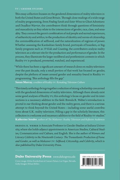 This essay collection focuses on the gendered dimensions of reality television in both the United States and Great Britain. Through close readings of a wide range of reality programming, from Finding Sarah and Sister Wives to Ghost Adventures and Deadliest Warrior, the contributors think through questions of femininity and masculinity, as they relate to the intersections of gender, race, class, and sexuality. They connect the genre's combination of real people and surreal experiences, of authenticity and artifice, to the production of identity and norms of citizenship, the commodification of selfhood, and the naturalization of regimes of power. Whether assessing the Kardashian family brand, portrayals of hoarders, or big-family programs such as 19 Kids and Counting, the contributors analyze reality television as a relevant site for the production and performance of gender. In the process, they illuminate the larger neoliberal and postfeminist contexts in which reality TV is produced, promoted, watched, and experienced. Contributors. David Greven, Dana Heller, Su Holmes, Deborah Jermyn, Misha Kavka, Amanda Ann Klein, Susan Lepselter, Diane Negra, Laurie Ouellette, Gareth Palmer, Kirsten Pike, Maria Pramaggiore, Kimberly Springer, Rebecca Stephens, Lindsay Steenberg, Brenda R. Weber