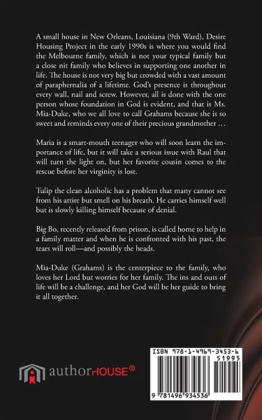A small house in New Orleans, Louisiana (9th Ward), Desire Housing Project in the early 1990s is where you would find the Melbourne family, which is not your typical family but a close nit family who believes in supporting one another in life. The house is not very big but crowded with a vast amount of paraphernalia of a lifetime. God's presence is throughout every wall, nail and screw. However, all is done with the one person whose foundation in God is evident, and that is Ms. Mia-Duke, who we all love to call Grahams because she is so sweet and reminds every one of their precious grandmother ... Maria is a smart-mouth teenager who will soon learn the importance of life, but it will take a serious issue with Raul that will turn the light on, but her favorite cousin comes to the rescue before her virginity is lost. Tulip the clean alcoholic has a problem that many cannot see from his attire but smell on his breath. He carries himself well but is slowly killing himself because of denial. Big Bo, recently released from prison, is called home to help in a family matter and when he is confronted with his past, the tears will roll-and possibly the heads. Mia-Duke (Grahams) is the centerpiece to the family, who loves her Lord but worries for her family. The ins and outs of life will be a challenge, and her God will be her guide to bring it all together.