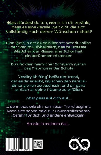 Reality Shifting - der neue Onlinetrend scheint die Antwort auf meine Bitten an das Universum zu sein.Ich bin die unbeliebte Streberin, verspottet von den IT - Girls der Schule rund um Paula und unglücklich verliebt in den heißesten Typen der Schule.All das könnte sich ändern, wenn ich meine Seele im Schlaf in das von mir gestaltete Paralleluniversum shiften könnte. Ich wäre beliebt, auf Partys der Stargast und natürlich die Freundin an Valentins Seite.Mit dem Skript unter meinem Kopfkissen lege ich mich ins Bett. 10...9...8...7...6... beginne ich den Countdown, der mein Eintritt in eine bessere (Parallel)welt sein soll. Ich ahnte nicht, welche Falltür in die tiefste Dunkelheit meiner Seele, ich mit diesem Trend tatsächlich öffnete.