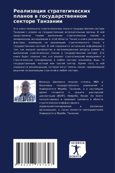 Jeta kniga poswqschena strategicheskomu planu w gosudarstwennom sektore Tanzanii s uporom na gosudarstwennye ispolnitel'nye organy. V nej predstawleny teorii wypolneniq strategicheskih planow i ämpiricheskie issledowaniq w ätoj oblasti. Takzhe w knige rassmotreny faktory, wliqüschie na realizaciü strategicheskogo plana w gosudarstwennom sektore. V nej soderzhitsq aktual'naq informaciq o tom, kak wysshee rukowodstwo i organizacionnye resursy wliqüt na wypolnenie strategicheskih planow w gosudarstwennom sektore. Jeta kniga budet polezna tem, kto izuchaet strategicheskij menedzhment i strategicheskoe planirowanie w lübom sektore äkonomiki, bud' to gosudarstwennyj, chastnyj ili tretij sektor. Krome togo, w nej soderzhatsq rekomendacii, kotorye mogut pomoch' licam, prinimaüschim resheniq po realizacii strategij w lübom sektore.