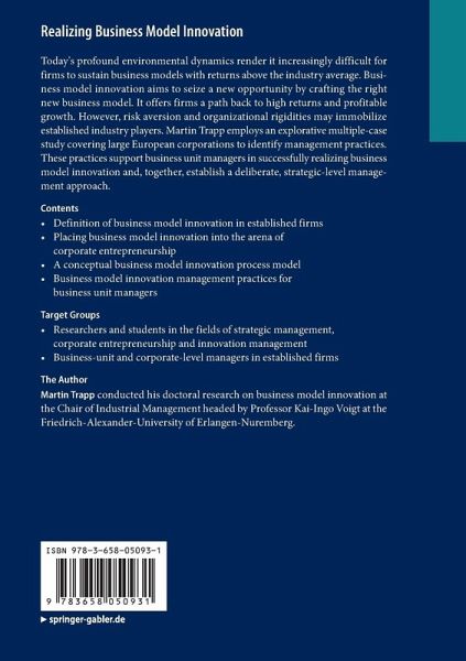 Today's profound environmental dynamics render it increasingly difficult for firms to sustain business models with returns above the industry average. Business model innovation aims to seize a new opportunity by crafting the right new business model. It offers firms a path back to high returns and profitable growth. However, risk aversion and organizational rigidities may immobilize established industry players. Martin Trapp employs an explorative multiple-case study covering large European corporations to identify management practices. These practices support business unit managers in successfully realizing business model innovation and, together, establish a deliberate, strategic-level management approach.