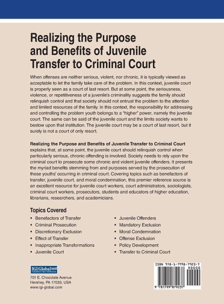 When offenses are neither serious, violent, nor chronic, it is typically viewed as acceptable to let the family take care of the problem. In this context, juvenile court is properly seen as a court of last resort. But at some point, the seriousness, violence, or repetitiveness of a juvenile's criminality suggests the family should relinquish control and that society should not entrust the problem to the attention and limited resources of the family. In this context, the responsibility for addressing and controlling the problem youth belongs to a "higher" power, namely the juvenile court. The same can be said of the juvenile court and the limits society wants to bestow upon that institution. The juvenile court may be a court of last resort, but it surely is not a court of only resort. Realizing the Purpose and Benefits of Juvenile Transfer to Criminal Court explains that, at some point, the juvenile court should relinquish control when particularly serious, chronic offending is involved. Society needs to rely upon the criminal court to prosecute some chronic and violent juvenile offenders. It presents the myriad benefits stemming from and purposes served by the prosecution of these youths' occurring in criminal court. Covering topics such as benefactors of transfer, juvenile court, and moral condemnation, this premier reference source is an excellent resource for juvenile court workers, court administrators, sociologists, criminal court workers, prosecutors, students and educators of higher education, librarians, researchers, and academicians.