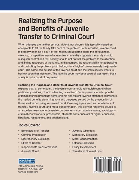 When offenses are neither serious, violent, nor chronic, it is typically viewed as acceptable to let the family take care of the problem. In this context, juvenile court is properly seen as a court of last resort. But at some point, the seriousness, violence, or repetitiveness of a juvenile's criminality suggests the family should relinquish control and that society should not entrust the problem to the attention and limited resources of the family. In this context, the responsibility for addressing and controlling the problem youth belongs to a "higher" power, namely the juvenile court. The same can be said of the juvenile court and the limits society wants to bestow upon that institution. The juvenile court may be a court of last resort, but it surely is not a court of only resort. Realizing the Purpose and Benefits of Juvenile Transfer to Criminal Court explains that, at some point, the juvenile court should relinquish control when particularly serious, chronic offending is involved. Society needs to rely upon the criminal court to prosecute some chronic and violent juvenile offenders. It presents the myriad benefits stemming from and purposes served by the prosecution of these youths' occurring in criminal court. Covering topics such as benefactors of transfer, juvenile court, and moral condemnation, this premier reference source is an excellent resource for juvenile court workers, court administrators, sociologists, criminal court workers, prosecutors, students and educators of higher education, librarians, researchers, and academicians.