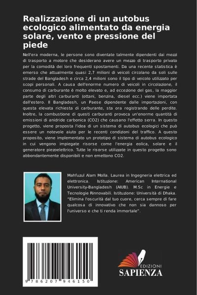 Nell'era moderna, le persone sono diventate talmente dipendenti dai mezzi di trasporto a motore che desiderano avere un mezzo di trasporto privato per la comodità dei loro frequenti spostamenti. Da una recente statistica è emerso che attualmente quasi 2,7 milioni di veicoli circolano da soli sulle strade del Bangladesh e circa 2,4 milioni sono il tipo di veicolo utilizzato per scopi personali. A causa dell'enorme numero di veicoli in circolazione, il consumo di carburante è molto elevato e, ad eccezione del gas, la maggior parte degli altri carburanti (ottani, benzina, diesel ecc.) viene importata dall'estero. Il Bangladesh, un Paese dipendente dalle importazioni, con questa elevata richiesta di carburante, sta ora registrando delle perdite. Inoltre, la combustione di questi carburanti provoca un'enorme quantità di emissioni di anidride carbonica (CO2) che causano l'effetto serra. In questo progetto, viene proposta l'idea di un sistema di autobus ecologici che può essere un notevole aiuto per le recenti condizioni del traffico. A questo proposito, viene implementato un prototipo di sistema di autobus ecologico in cui vengono impiegate risorse come l'energia eolica, solare e il generatore piezoelettrico. Tutte le risorse utilizzate in questo progetto sono abbondantemente disponibili e non emettono CO2.
