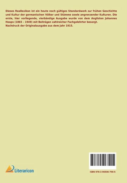 Dieses Reallexikon ist ein heute noch gültiges Standardwerk zur frühen Geschichte und Kultur der germanischen Völker und Stämme sowie angrenzender Kulturen. Die erste, hier vorliegende, vierbändige Ausgabe wurde von dem Anglisten Johannes Hoops (1865 ¿ 1949) mit Beiträgen zahlreicher Fachgelehrter besorgt. Nachdruck der Originalausgabe aus dem Jahr 1915.