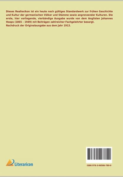 Dieses Reallexikon ist ein heute noch gültiges Standardwerk zur frühen Geschichte und Kultur der germanischen Völker und Stämme sowie angrenzender Kulturen. Die erste, hier vorliegende, vierbändige Ausgabe wurde von dem Anglisten Johannes Hoops (1865 ¿ 1949) mit Beiträgen zahlreicher Fachgelehrter besorgt. Nachdruck der Originalausgabe aus dem Jahr 1913.