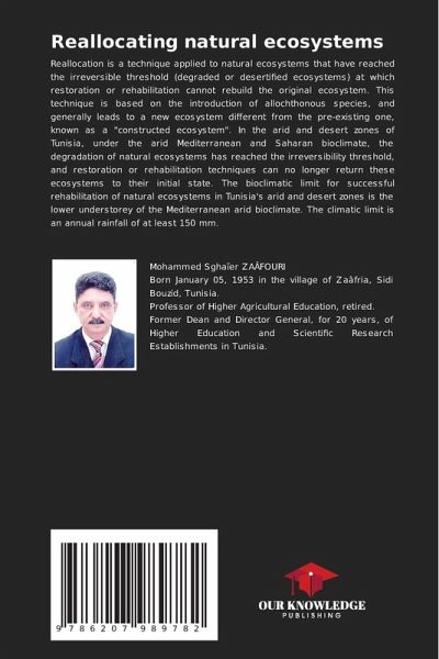 Reallocation is a technique applied to natural ecosystems that have reached the irreversible threshold (degraded or desertified ecosystems) at which restoration or rehabilitation cannot rebuild the original ecosystem. This technique is based on the introduction of allochthonous species, and generally leads to a new ecosystem different from the pre-existing one, known as a "constructed ecosystem". In the arid and desert zones of Tunisia, under the arid Mediterranean and Saharan bioclimate, the degradation of natural ecosystems has reached the irreversibility threshold, and restoration or rehabilitation techniques can no longer return these ecosystems to their initial state. The bioclimatic limit for successful rehabilitation of natural ecosystems in Tunisia's arid and desert zones is the lower understorey of the Mediterranean arid bioclimate. The climatic limit is an annual rainfall of at least 150 mm.