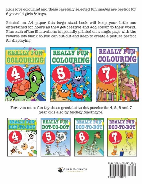 Really Fun Colouring Book For 6 Year Olds Fun & creative colouring for six year old children Kids love colouring and these carefully selected fun images are perfect for 6 year old girls & boys. Printed on A4 paper this large sized book will keep your little one entertained for hours as they get creative and add colour to their world. Plus each of the illustrations is specially printed on a single page with the reverse left blank so you can cut it out and keep to create a picture perfect for displaying. Also available: Really Fun Colouring Book For 4 Year Olds Really Fun Colouring Book For 5 Year Olds Really Fun Colouring Book For 7 Year Olds Really Fun Dot-To-Dot For 4 Year Olds Really Fun Dot-To-Dot For 5 Year Olds Really Fun Dot-To-Dot For 6 Year Olds Really Fun Dot-To-Dot For 7 Year Olds