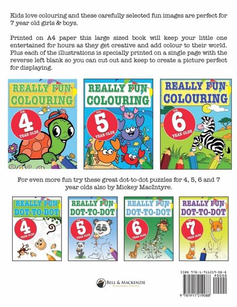 Really Fun Colouring Book For 7 Year Olds Fun & creative colouring for seven year old children Kids love colouring and these carefully selected fun images are perfect for 7 year old girls & boys. Printed on A4 paper this large sized book will keep your little one entertained for hours as they get creative and add colour to their world. Plus each of the illustrations is specially printed on a single page with the reverse left blank so you can cut it out and keep to create a picture perfect for displaying. Also available: Really Fun Colouring Book For 4 Year Olds Really Fun Colouring Book For 5 Year Olds Really Fun Colouring Book For 6 Year Olds Really Fun Dot-To-Dot For 4 Year Olds Really Fun Dot-To-Dot For 5 Year Olds Really Fun Dot-To-Dot For 6 Year Olds Really Fun Dot-To-Dot For 7 Year Olds