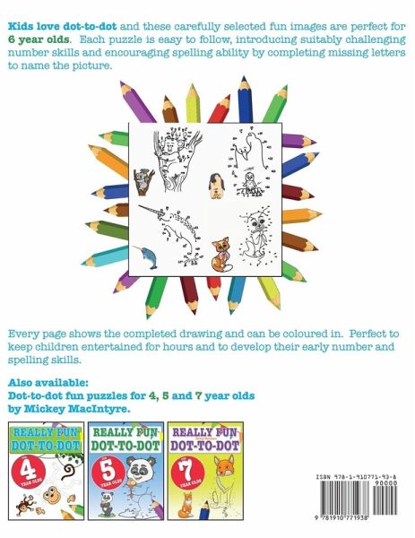 Really Fun Dot To Dot for 6 Year Olds Fun, educational dot-to-dot puzzles for six year old children Kids love dot-to-dot and these carefully selected fun images are perfect for 6 year olds. Each puzzle is easy to follow, introducing suitably challenging number skills and encouraging spelling ability by completing missing letters to name the picture. Every page shows the completed drawing and can be coloured in. Perfect to keep kids entertained for hours and to develop their early number and spelling skills. Also available: Really Fun Dot-To-Dot For 4 Year Olds Really Fun Dot-To-Dot For 5 Year Olds Really Fun Dot-To-Dot For 7 Year Olds