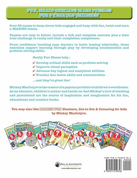 Fun, brain-tickling maze activity puzzle book for 6 year old children. Over 60 fun activity mazes to keep clever kids engaged and busy with awesome, twist-and-turn amazing mazes. Puzzles are easy to follow, include a tick and complete exercise plus a time trial challenge to really test their completion competence. From confidence boosting easy mazes to brain teasing labyrinths, these exercises support learning through play by developing concentration and problem solving skills. Really Fun Mazes help : Develop critical skills such as problem solving Improve visual perception Advance key logical and analytical abilities Practice fine motor skills and concentration ...and they're great fun! Mickey MacIntyre is the creator of a popular portfolio of children's activity books. As an educator, children's author and hands-on-dad Mickey's love of teaching and parenthood are the source of inspiration and imagination for his fun, educational and creative books. Get new release updates by clicking the 'follow' button on the left and visit his author page for other Really Fun books.