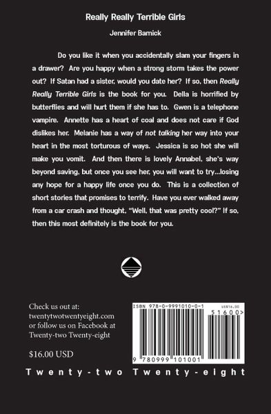 Do you like it when you accidentally slam your fingers in a drawer? Are you happy when a strong storm takes the power out? If Satan had a sister, would you date her? If so, then Really Really Terrible Girls is the book for you. Della is horrified by butterflies and will hurt them if she has to. Gwen is a telephone vampire. Annette has a heart of coal and does not care if God dislikes her. Melanie has a way of not talking her way into your heart in the most torturous of ways. Jessica is so hot she will make you vomit. And then there is lovely Annabel, she's way beyond saving, but once you see her, you will want to try…losing any hope for a happy life once you do. This is a collection of short stories that promises to terrify. Have you ever walked away from a car crash and thought, "Well, that was pretty cool?" If so, then this most definitely is the book for you.
