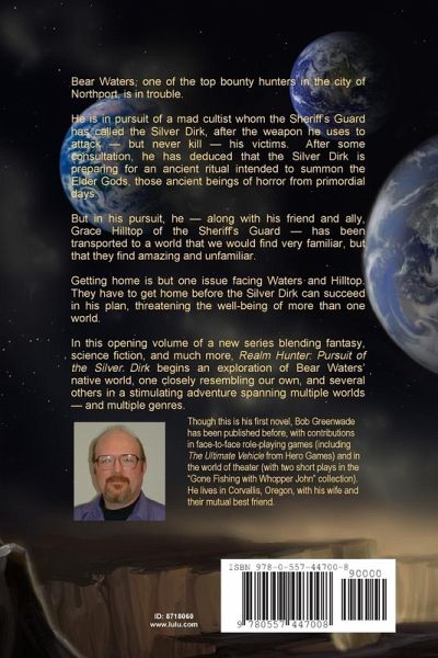 Bear Waters, one of the top bounty hunters in the city of Northport, is in trouble. He is in pursuit of a mad cultist whom the Sheriff's Guard has called the Silver Dirk, after the weapon he uses to attack - but never kill - his victims. After some consultation, he has deduced that the Silver Dirk is preparing for an ancient ritual intended to summon the Elder Gods, those ancient beings of horror from primordial days. But in his pursuit, he - along with his friend and ally, Grace Hilltop of the Sheriff's Guard - has been transported to a world that we would find very familiar, but that they find amazing and unfamiliar. Getting home is but one issue facing Waters and Hilltop. They have to get home before the Silver Dirk can succeed in his plan, threatening the well-being of more than one world.