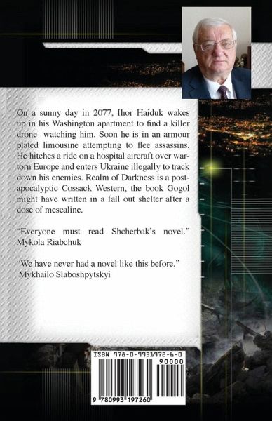On a sunny day in 2077 Ihor Haiduk wakes up in his Washington apartment with is lover beside him and a killer drone hovering above his head. Soon he is accused of murder and is fleeing assassins while travelling in an armour-plated limousine from the White House to the Canadian border. He hitches a ride on a hospital aircraft and travels over war-torn Europe with Bozhena, the niece of the president's aide, who he has been asked to rescue. After leaving Bozhena in Poland, he enters Ukraine illegally to track down his enemies and save Ukraine. Will he managed to find his enemies before they find and kill him? Will he see Bozhena again? Realm of Darkness is a post apocalyptic, Cossack Western. It considers what could happen in Europe, and indeed the world, when corruption and greed takes over. It is the book Gogol might have written in a fall out shelter after a dose of mescaline. Dr. Yuriy Shcherbak is a former Ukrainian ambassador and journalist, who became internationally renowned with the publication of his novel ‘Chornobyl', about the explosion at the nuclear power plant. He was elected a member of the world academy of art and science in 2013.