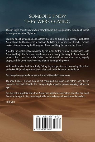 Someone knew they were coming. Though Nayla hadn't known where they'd land in this foreign realm, they didn't expect this-a group of Idian Skyborne. Learning one of her companions suffered dire injuries during their passage, a reluctant Nayla allows the Idians access to heal him. And after a mysterious face from her dreams makes his debut among the Idian group, Nayla can't help but expose her distrust. A visit to the settlements established by the Idians for the return of the Banished leads Nayla and Rhijn, the face from her dreams, into a deadly discovery. As Nayla begins to process the connection to the Ember she holds and the mysterious male, tragedy erupts, and the duo narrowly escape after combining their powers. With her distrust of the Idians finally fading, Nayla hopes to avert the coming bloodshed and takes Rhijn and a group of emissaries back to the Realm of the Banished. But things have gotten far worse in the short time she'd been away. The mad healer, Emerson, has all but consumed the realm, and before long, they're caught in the heat of battle, the carnage Nayla hoped to prevent evolving before her eyes. But this battle may take more from Nayla than she'd ever lost before, and after her worst fears are brought to life, something inside her awakens and transforms the realms... FOREVER ¿ Content/Trigger Warning: Includes strong language, physical violence, and consensual sex.