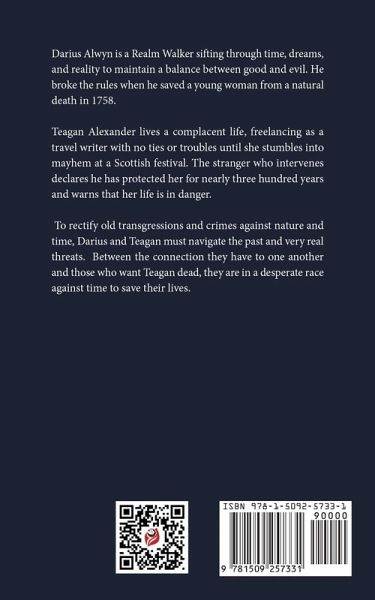 Darius Alwyn is a Realm Walker sifting through time, dreams, and reality to maintain a balance between good and evil. He broke the rules when he saved a young woman from a natural death in 1758. Teagan Alexander lives a complacent life, freelancing as a travel writer with no ties or troubles until she stumbles into mayhem at a Scottish festival. The stranger who intervenes declares he has protected her for nearly three hundred years and warns that her life is in danger. To rectify old transgressions and crimes against nature and time, Darius and Teagan must navigate the past and very real threats. Between the connection they have to one another and those who want Teagan dead, they are in a desperate race against time to save their lives.