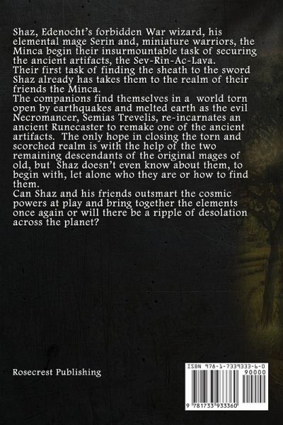 Shaz, Edenocht's forbidden War wizard, his elemental mage Serin and, miniature warriors, the Minca begin their insurmountable task of securing the ancient artifacts, the Sev-Rin-Ac-Lava. Their first task of finding the sheath to the sword Shaz already has takes them to the realm of their friends the Minca.The companions find themselves in a world torn open by earthquakes and melted earth as the evil Necromancer Semias Trevelis re-incarnates an ancient Runecaster to remake one of the ancient artifacts. The only hope in closing the torn and scorched realm is with the help of the two remaining descendants of the original mages of old, but Shaz doesn't even know about them, to begin with, let alone who they are or how to find them. Can Shaz and his friends be able to outsmart the cosmic powers at play and bring together the elements once again or will there be a ripple of desolation across the planet?