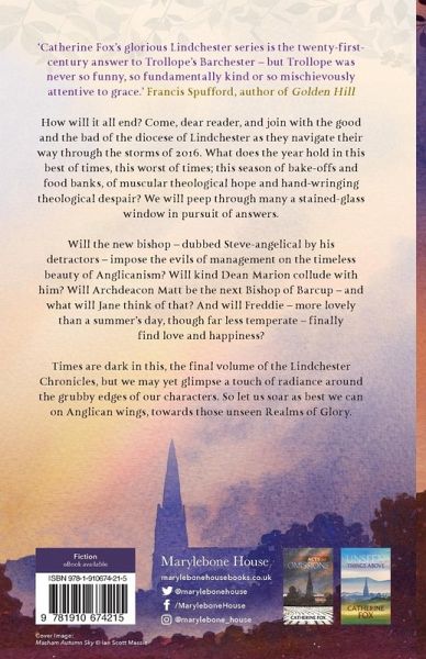 Catherine Fox is an established and popular author. Her debut novel, Angels and Men (reissued in 2014) was a Sunday Times Pick of the Year. Her other books include The Benefits of Passion and Love for the Lost (reissued in 2015), Acts and Omissions which was chosen as a Guardian Book of 2014, and its sequel, Unseen Things Above (2015). Catherine lectures at Manchester Metropolitan University and is married to the Bishop of Sheffield.