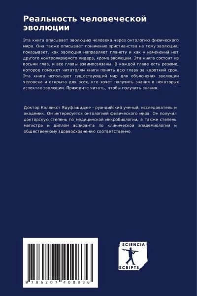 Jeta kniga opisywaet äwolüciü cheloweka cherez ontologiü fizicheskogo mira. Ona takzhe opisywaet ponimanie hristianstwa na temu äwolücii, pokazywaet, kak äwolüciq naprawlqet planetu i kak u izmenenij net drugogo kontroliruemogo lidera, krome äwolücii. Jeta kniga sostoit iz wos'mi glaw, i wse glawy wzaimoswqzany. V kazhdoj glawe est' rezüme, kotoroe pomozhet chitatelqm knigi ponqt' wsü glawu za korotkij srok. Jeta kniga ispol'zuet suschestwuüschij mir dlq ob#qsneniq äwolücii cheloweka i otkryta dlq wseh, kto hochet poluchit' znaniq w nekotoryh aspektah äwolücii. Prihodite chitat', chtoby poluchit' znaniq.