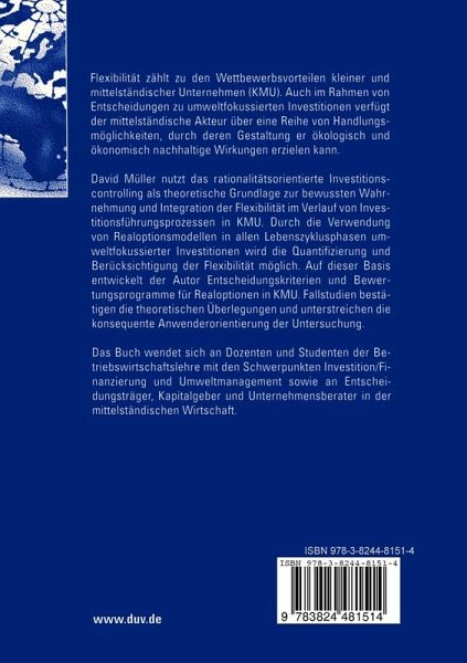 David Müller nutzt das rationalitätsorientierte Investitionscontrolling als theoretische Grundlage zur bewussten Wahrnehmung und Integration der Flexibilität im Verlauf von Investitionsführungsprozessen in KMU. Durch die Verwendung von Realoptionsmodellen in allen Lebenszyklusphasen umweltfokussierter Investitionen wird die Quantifizierung und Berücksichtigung der Flexibilität möglich. Auf dieser Basis entwickelt der Autor Entscheidungskriterien und Bewertungsprogramme für Realoptionen in KMU. Fallstudien bestätigen die theoretischen Überlegungen und unterstreichen die konsequente Anwenderorientierung der Untersuchung.