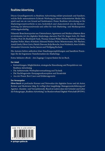 Dieses Grundlagenwerk zu Realtime Advertising erklärt praxisnah und fundiert, welche Rolle automatisierte Echtzeit-Werbung in einem orchestrierten Media-Mix spielt und wie sie von Grund auf funktioniert. Denn: Realtime Advertising ist für Marketingverantwortliche so neu, bedrohlich und chancenreich wie die Internetwerbung zur Jahrtausendwende und selbst für viele Marketing- und Mediaexperten erklärungsbedürftig.