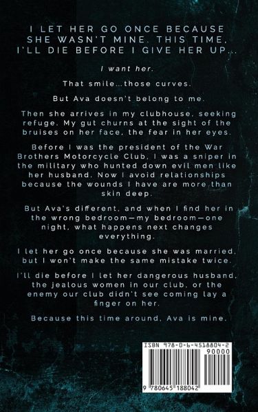 I let her go once because she wasn't mine. This time, I'll die before I give her up... I want her. That smile... those curves. But Ava doesn't belong to me. Then she arrives in my clubhouse, seeking refuge. My gut churns at the sight of the bruises on her face, the fear in her eyes. Before I was the president of the War Brothers Motorcycle Club, I was a special forces sniper who hunted down evil men like her husband. Now I avoid relationships because the wounds I have are more than skin deep. But Ava's different, and when I find her in the wrong bedroom-my bedroom-one night, what happens next changes everything. I let her go once because she was married, but I won't make the same mistake twice. I'll die before I let her dangerous husband, the jealous women in our club, or the enemy our club didn't see coming lay a finger on her. Because this time around, Ava is mine.