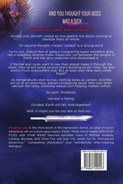 AGAINST ALL ODDS, THEY'VE DONE IT. For the first time in history, human and raknoth stand united against the doom coming to swallow them all whole. Okay. On second thought, "united" is probably a strong word. Turns out, mutual fear of galaxy-conquering super monsters does not a steadfast alliance make. Especially not between the people of Earth and the very creatures who devastated it. So yeah. Problems. Especially when Galaxy-Conquering Super Monster #1 arrives on the scene, cutting down raknoth like scaly weeds and telepathically devolving the armies of Earth into little more than frenzied hordes of wild animals. Harvest is falling. And if Jarek and Rachel want to see their planet survive the week, they have one hell of an immortal, planet-killing monster to take down...
