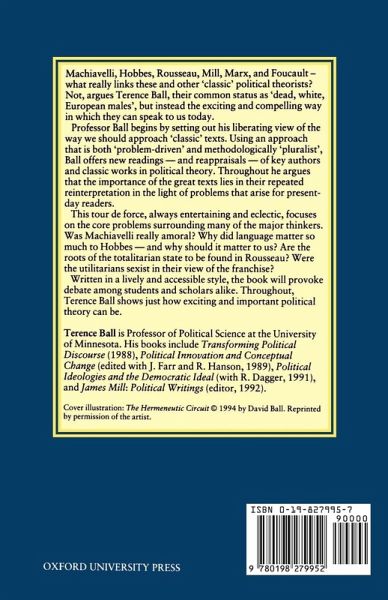 Machiavelli, Hobbes, Rousseau, Mill, and Marx, and Foucault - what really links these and other `classic' political theorists? Not, argues Terence Ball, their common status as `dead, white, European males', but instead the exciting and compelling way in which they can speak to us today. Professor Ball begins by setting out his liberating view of the way we should approach `classic' texts. Using an approach that is both `problem-driven' and methodologically `pluralist', Ball offers new readings - and reappraisals - of key authors and classic works in political theory. Throughout he argues that the importance of the great texts lies in their repeated reinterpretation in the light of problems that arise for present-day readers. This tour-de-force, always entertaining and eclectic, focuses on the core problems surrounding many of the major thinkers. Was Machiavelli really amoral? Why did language matter so much to Hobbes - and why should it matter to us? Are the roots of the totalitarian state to be found in Rousseau? Were the utilitarians sexist in their view of the franchise? Written in lively and accessible styly, the book will provoke debate among students and scholars alike. Throughout, Terence Ball shows just how exciting and important political theory can be.