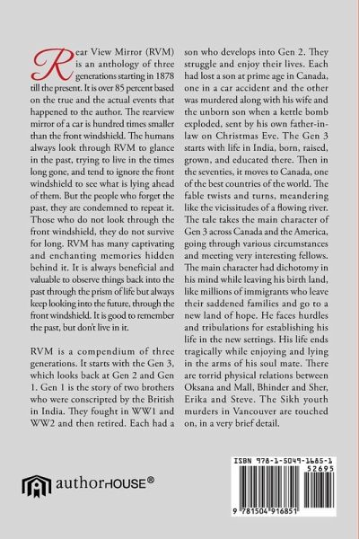 Rear View Mirror (RVM) is an anthology of three generations starting in 1878 till the present. It is over 85 percent based on the true and the actual events that happened to the author. The rearview mirror of a car is hundred times smaller than the front windshield. The humans always look through RVM to glance in the past, trying to live in the times long gone, and tend to ignore the front windshield to see what is lying ahead of them. But the people who forget the past, they are condemned to repeat it. Those who do not look through the front windshield, they do not survive for long. RVM has many captivating and enchanting memories hidden behind it. It is always beneficial and valuable to observe things back into the past through the prism of life but always keep looking into the future, through the front windshield. It is good to remember the past, but don't live in it. RVM is a compendium of three generations. It starts with the Gen 3, which looks back at Gen 2 and Gen 1. Gen 1 is the story of two brothers who were conscripted by the British in India. They fought in WW1 and WW2 and then retired. Each had a son who develops into Gen 2. They struggle and enjoy their lives. Each had lost a son at prime age in Canada, one in a car accident and the other was murdered along with his wife and the unborn son when a kettle bomb exploded, sent by his own father-in-law on Christmas Eve. The Gen 3 starts with life in India, born, raised, grown, and educated there. Then in the seventies, it moves to Canada, one of the best countries of the world. The fable twists and turns, meandering like the vicissitudes of a flowing river. The tale takes the main character of Gen 3 across Canada and the America, going through various circumstances and meeting very interesting fellows. The main character had dichotomy in his mind while leaving his birth land, like millions of immigrants who leave their saddened families and go to a new land of hope. He faces hurdles and tribulations for establishing his life in the new settings. His life ends tragically while enjoying and lying in the arms of his soul mate. There are torrid physical relations between Oksana and Mall, Bhinder and Sher, Erika and Steve. The Sikh youth murders in Vancouver are touched on, in a very brief detail.