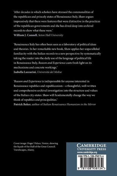 Political life in Renaissance Italy was held together by principles which underlay, or were used to justify, political proposals and decisions in practice. This wide-ranging comparative survey showcases the variety of political thinking across all five Italian republics, Florence, Venice, Genoa, Siena and Lucca, as well as princes and signori.