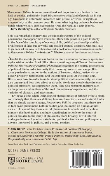 Reason and Politics explores the central phenomena of political life and, therefore, of human affairs in general. Amidst the seemingly endless books on more and more narrowly specialized topics within politics, Mark Blitz offers something very different. Reason and Politics: The Nature of Political Phenomena examines the central phenomena of political life in order to clarify their meaning, source, and range. Blitz gives particular attention to the notions of freedom, rights, justice, virtue, power, property, nationalism, and the common good. At the same time, Blitz shows how, in order to understand political matters correctly, we must also understand how they affect us directly. We do not merely theorize over political questions; we experience them. Blitz also considers matters such as the powers and motions of the soul, the nature of experience, and the varieties of pleasure and attachment. Living at a time when technological change makes it difficult even to claim convincingly that there are defining human characteristics and natural limits that we simply cannot change, Reason and Politics proposes that there are in fact basic phenomena not only in politics, but that make up human affairs as such. In examining these central phenomena in a lucid and articulate manner, this book makes a unique contribution not only to the study of politics but also to the study of philosophy more broadly. It will interest undergraduate and graduate students, political scientists and philosophers, those interested in politics, and general readers.