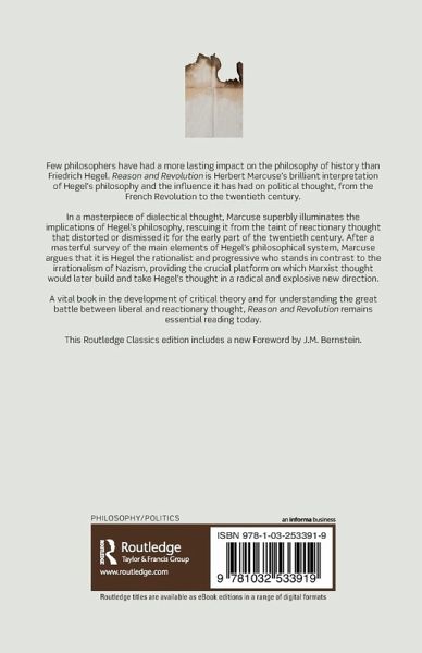 Few philosophers have had a more lasting impact on the philosophy of history than Friedrich Hegel. Reason and Revolution is Herbert Marcuse's brilliant interpretation of Hegel's philosophy and the influence it has had on political thought, from the French Revolution to the twentieth century.