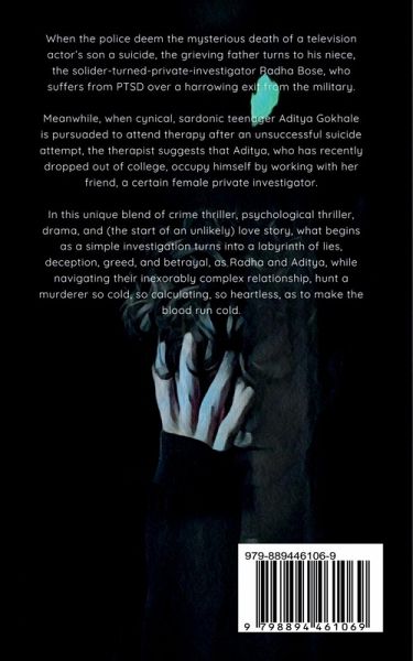 When the police deem the mysterious death of a television actor's son a suicide, the grieving father turns to his niece, the solider-turned-private-investigator Radha Bose, who suffers from PTSD over a harrowing exit from the military. Meanwhile, when cynical, sardonic teenager Aditya Gokhale is pursuaded to attend therapy after an unsuccessful suicide attempt, the therapist suggests that Aditya, who has recently dropped out of college, occupy himself by working with her friend, a certain female private investigator. In this unique blend of crime thriller, psychological thriller, drama, and (the start of an unlikely) love story, what begins as a simple investigation turns into a labyrinth of lies, deception, greed, and betrayal, as Radha and Aditya, while navigating their inexorably complex relationship, hunt a murderer so cold, so calculating, so heartless, as to make the blood run cold.
