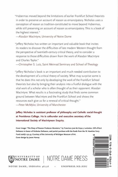 In Reason, Tradition, and the Good, Jeffery L. Nicholas addresses the failure of reason in modernity to bring about a just society, a society in which people can attain fulfillment. Developing the critical theory of the Frankfurt School, Nicholas argues that we rely too heavily on a conception of rationality that is divorced from tradition and, therefore, incapable of judging ends. Without the ability to judge ends, we cannot engage in debate about the good life or the proper goods that we as individuals and as a society should pursue. Nicholas claims that the project of enlightenment-defined as the promotion of autonomous reason-failed because it was based on a deformed notion of reason as mere rationality, and that a critical theory of society aimed at human emancipation must turn to substantive reason, a reason constituted by and constitutive of tradition. To find a reason capable of judging ends, Nicholas suggests, we must turn to Alasdair MacIntyre's Thomistic-Aristotelianism. Substantive reason comprises thinking and acting on the set of standards and beliefs within a particular tradition. It is the impossibility of enlightenment rationality to evaluate ends and the possibility of substantive reason to evaluate ends that makes the one unsuitable and the other suitable for a critical theory of society. Nicholas's compelling argument, written in accessible language, remains committed to the promise of reason to help individuals achieve a good and just society and a good life. This requires, however, a complete revolution in the way we approach social life.