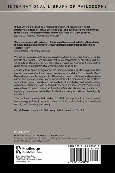 We call beliefs reasonable or unreasonable, justified or unjustified. What does this imply about belief? Does this imply that we are responsible for our beliefs and that we should be blamed for our unreasonable convictions? Or does it imply that we are in control of our beliefs and that what we believe is up to us? "Reason Without Freedom" argues that the major problems of epistemology have their roots in concerns about our control over and responsibility for belief. Owens focuses on the arguments of Descartes, Locke and Hume--the founders of epistemology--and presents a critical discussion of the current trends in contemporary epistemology. He proposes that the problems we confront today - skepticism, the analysis of knowledge, and debates on epistemic justification can be tackled when we have understood the moral psychology of belief.