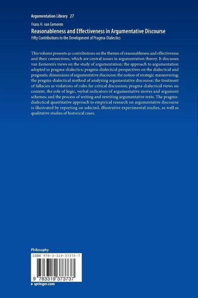 This volume presents 50 contributions on the themes of reasonableness and effectiveness and their connections, which are central issues in argumentation theory. It discusses van Eemeren's views on the study of argumentation; the approach to argumentation adopted in pragma-dialectics; pragma-dialectical perspectives on the dialectical and pragmatic dimensions of argumentative discourse; the notion of strategic maneuvering; the pragma-dialectical method of analyzing argumentative discourse; the treatment of fallacies as violations of rules for critical discussion; pragma-dialectical views on context, the role of logic, verbal indicators of argumentative moves and argument schemes; and the process of writing and rewriting argumentative texts. The pragma-dialectical quantitative approach to empirical research on argumentative discourse is illustrated by reporting on selected, illustrative experimental studies, as well as qualitative studies of historical cases.